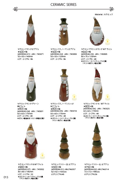 セラミック特有の柔らかな質感が魅力のサンタやスノーマン。LEDティーライト付きのモデルは、優しく揺れる光で卓上を演出します。
