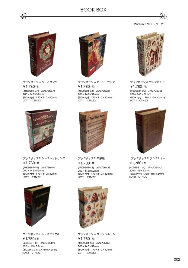 アンティーク調の洋書をイメージした収納ボックス。サンタやクリスマスのヴィンテージアートが施され、インテリアとしてもギフトボックスとしても大人気です。