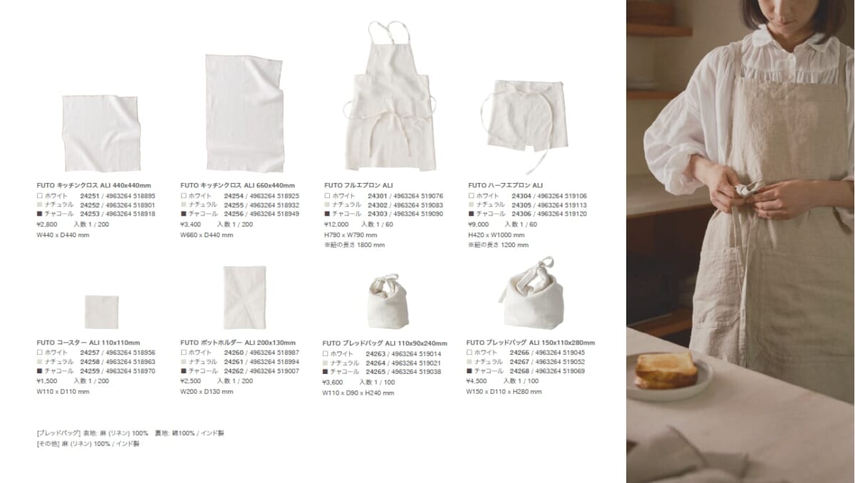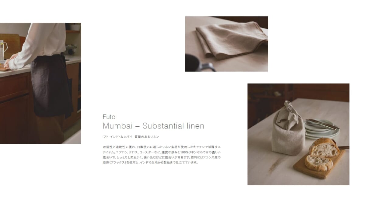 エプロン、クロス、コースターなど、適度な厚みと100%リネンならではの優しい風合いで、しっとりと柔らかく、使い込むほどに風合いが育ちます。
